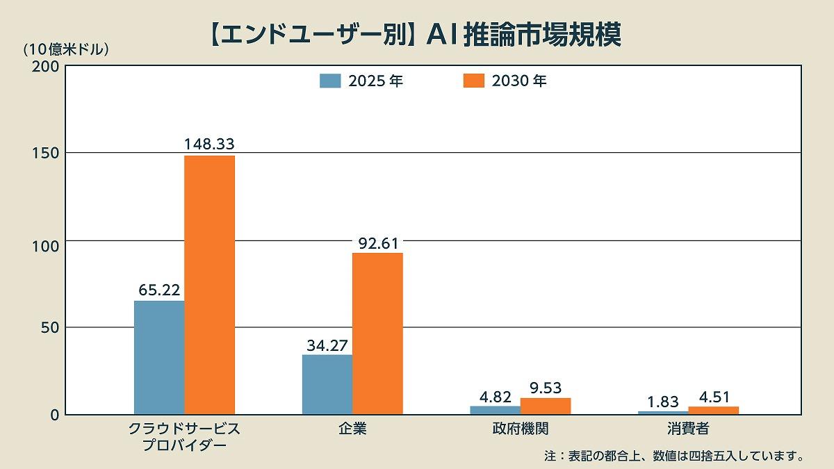 AI推論市場はエンドユーザー別に見ると、消費者/CSP/企業/政府機関の4つに分類できます。中でもCSPの世界市場シェアが大きく、2025年には652億2,000万米ドル(約10兆3,400億円)、2030年には1,483億3,000万米ドル(約23兆5,200億円)規模に達すると予測されています。CSPは、企業や開発者がオンプレミスで高額なインフラ投資をすることなく、大規模かつ高度なAI推論タスクを即座に実行できる環境を提供しています。これにより、専用ハードウェア、高速ネットワーク、拡張性の高いストレージへの投資がCSPを中心に加速しました。
