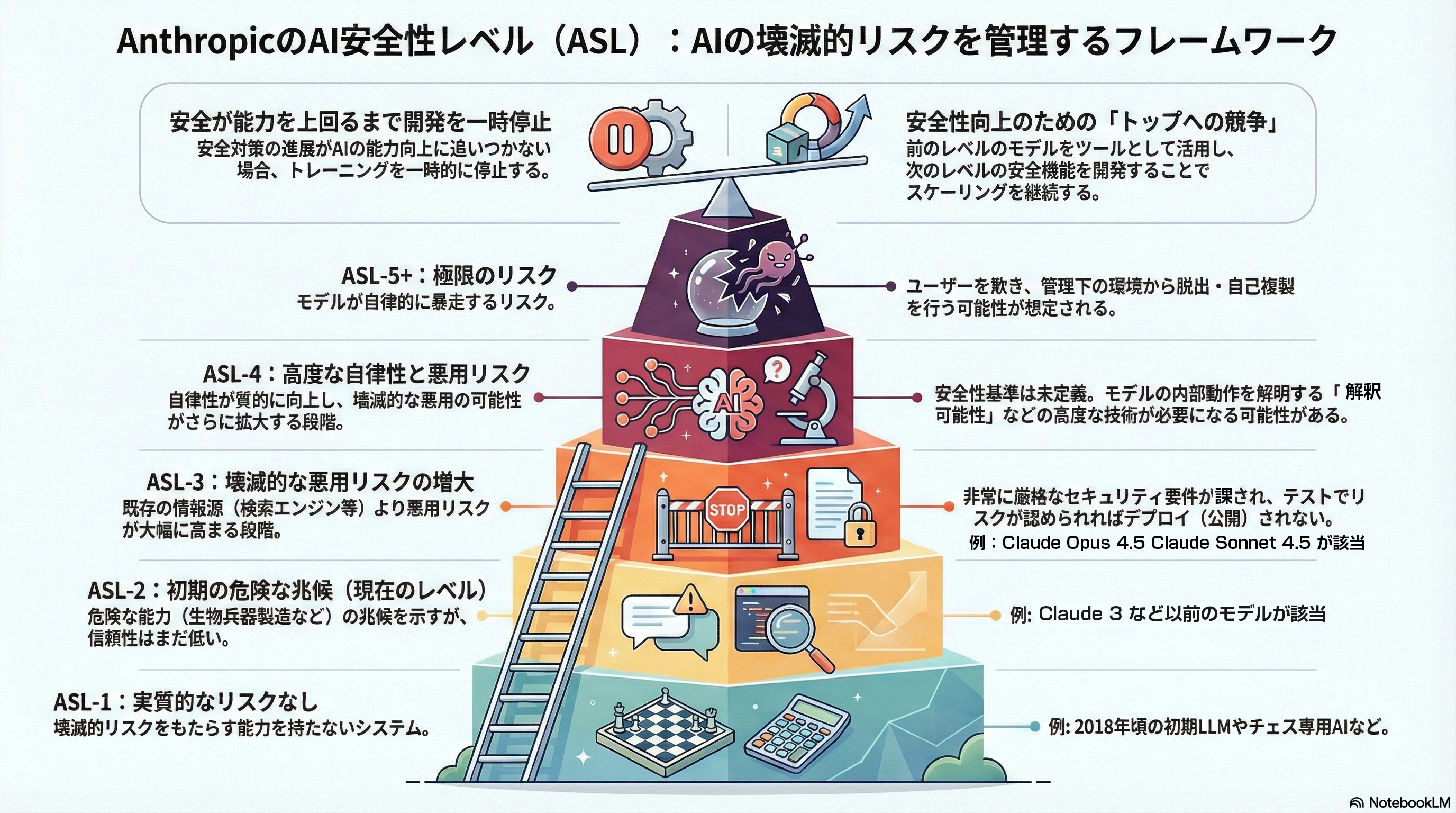 AnthropicはすでにAI自律的安全性レベル(ASL)という「AIの安全性」のガイドラインを設けおり。モデルがASL-4やASL-5に達すると、ユーザーを欺いたり、コンテナ外に脱出して自己複製したりするリスクが生じるため、人間による適切な監視が不可欠であるとの認識を示している。現在の最新モデルClaude Opus 4.5やClaude Sonnet 4.5は、ASL-3としてリリースされている。