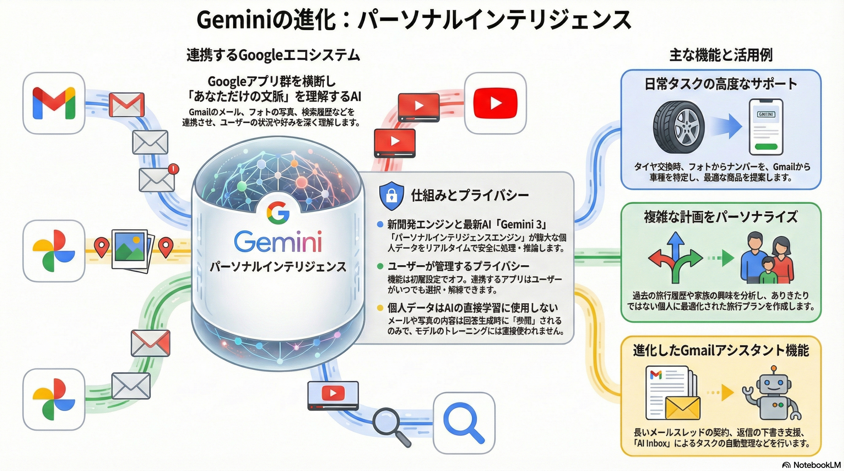 Personal Intelligenceは単なる過去の会話履歴の参照を超え、Gmailに保存されたメールやGoogleフォトの画像、YouTube視聴履歴、検索履歴などを横断的に分析し、ユーザーの状況に応じた文脈理解を行う。例えば、メールに含まれる車両情報を元に必要な商品の仕様を提示したり、過去の旅行写真を参照して最適なプランを提案したりすることが可能になると説明されている。これらの情報は、Gemini 3モデルを強化するコンテキスト推論機能により統合され、高度なパーソナライズを実現しているとされる。
