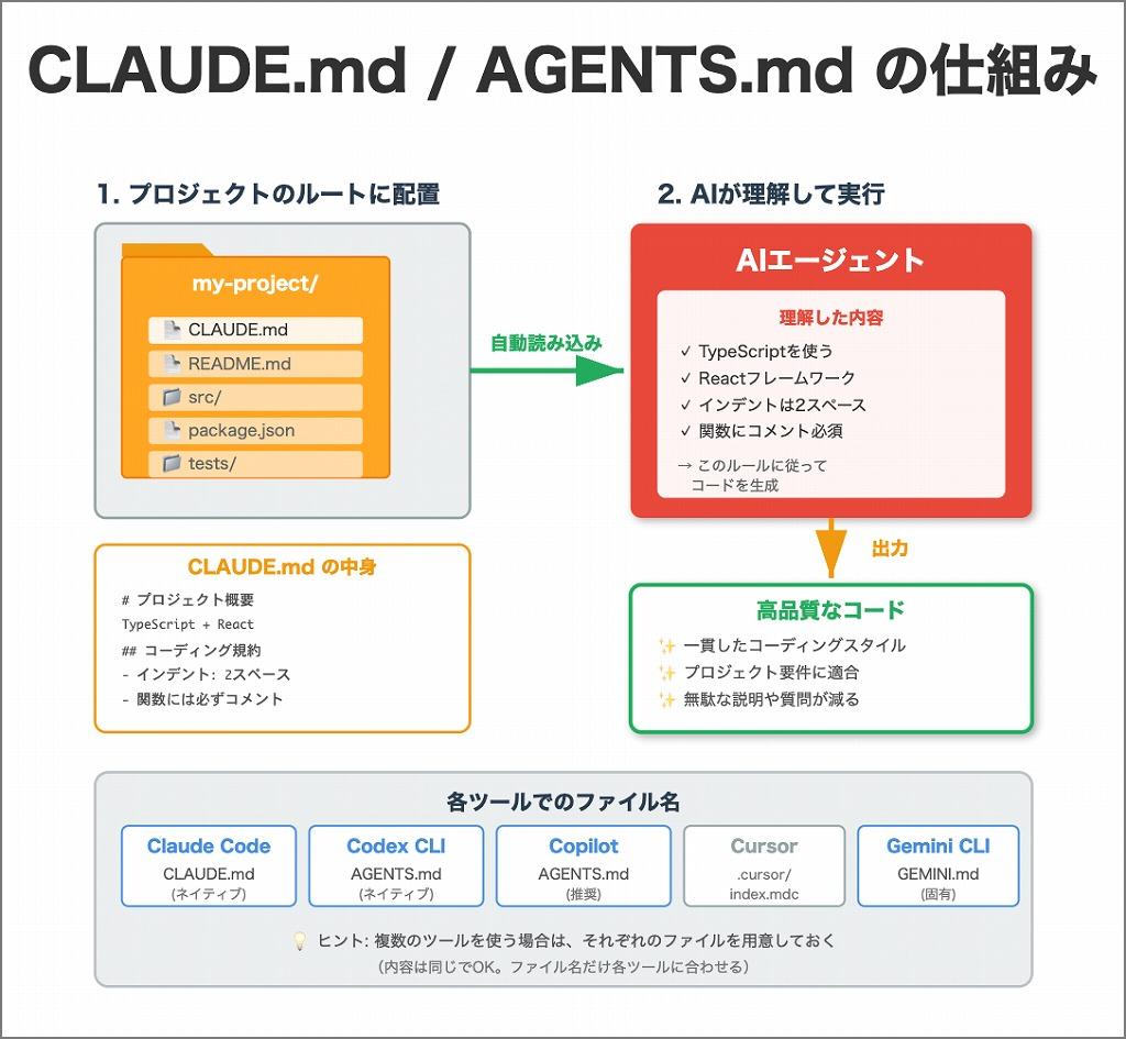 Claude Code専用だったCLAUDE.mdが業界に広まり、OpenAIのCodex CLIやGitHub CopilotはAGENTS.mdという名前で標準化を進めている。複数のツールを併用する場合は、両方のファイルを用意して対応する。