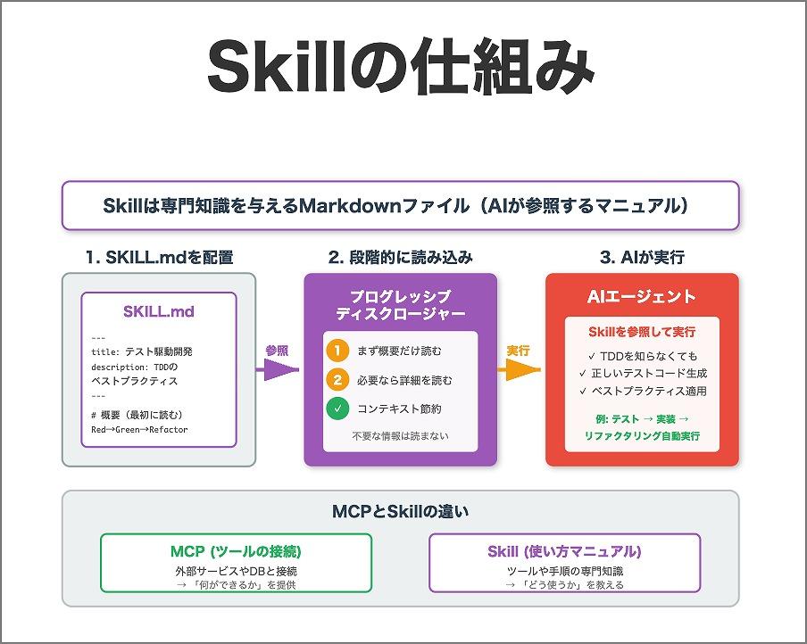 Skillは、AIエージェントに専門知識を与えるMarkdownファイルだ。SKILL.mdというファイルに手順や知識を書いておくと、AIが必要に応じて参照する。MCPが「ツールの接続」なら、Skillは「ツールの使い方マニュアル」に相当する。たとえば「テスト駆動開発」というSkillを用意しておけば、AIはSkillを参照して適切な手順でテストして開発できる。