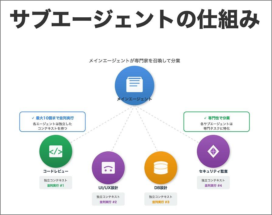 サブエージェントは、特定のタスクに特化したAIエージェントを呼び出す機能だ。メインのAIが「コードレビュー担当」「セキュリティ監査担当」といった専門家を必要に応じて召喚するイメージだ。サブエージェントは独立したコンテキストウィンドウを持つ。これにより、メインの会話を圧迫せずに専門的な作業を並列実行できる。Claude Codeでは最大10個のサブエージェントを同時に動かせる。
