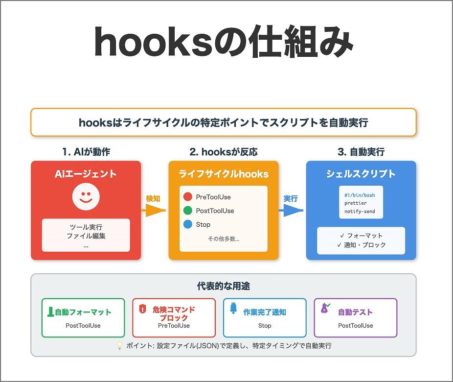 hooksは、AIエージェントの動作の特定タイミングでシェルスクリプトを自動実行する機能だ。「ファイル編集後に自動フォーマット」「実行前に危険なコマンドをブロック」といった制御ができる。個人開発で特に便利なのは「自動コードフォーマット」だ。AIが生成したコードを自動的にPrettierなどのツールで整形してくれる。また「作業完了通知」を設定すれば、長時間タスクの完了を音やポップアップで知らせてくれる。 【次ページ】カスタムコマンド、LSP、プラグインの「活用法」