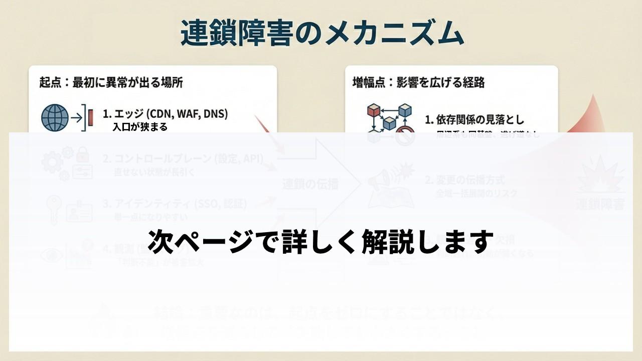 この第2の変更は全体に数秒で伝播するグローバル設定であり、特定条件下でFL1プロキシのルール処理に潜んでいたバグを踏み、HTTP 500を返す状態に入った。変更を戻すことで09:12に復旧した。ここで重要なのは、変更そのものが小さく見えても、伝播方式と前提条件の組み合わせで影響範囲が急拡大する点である。