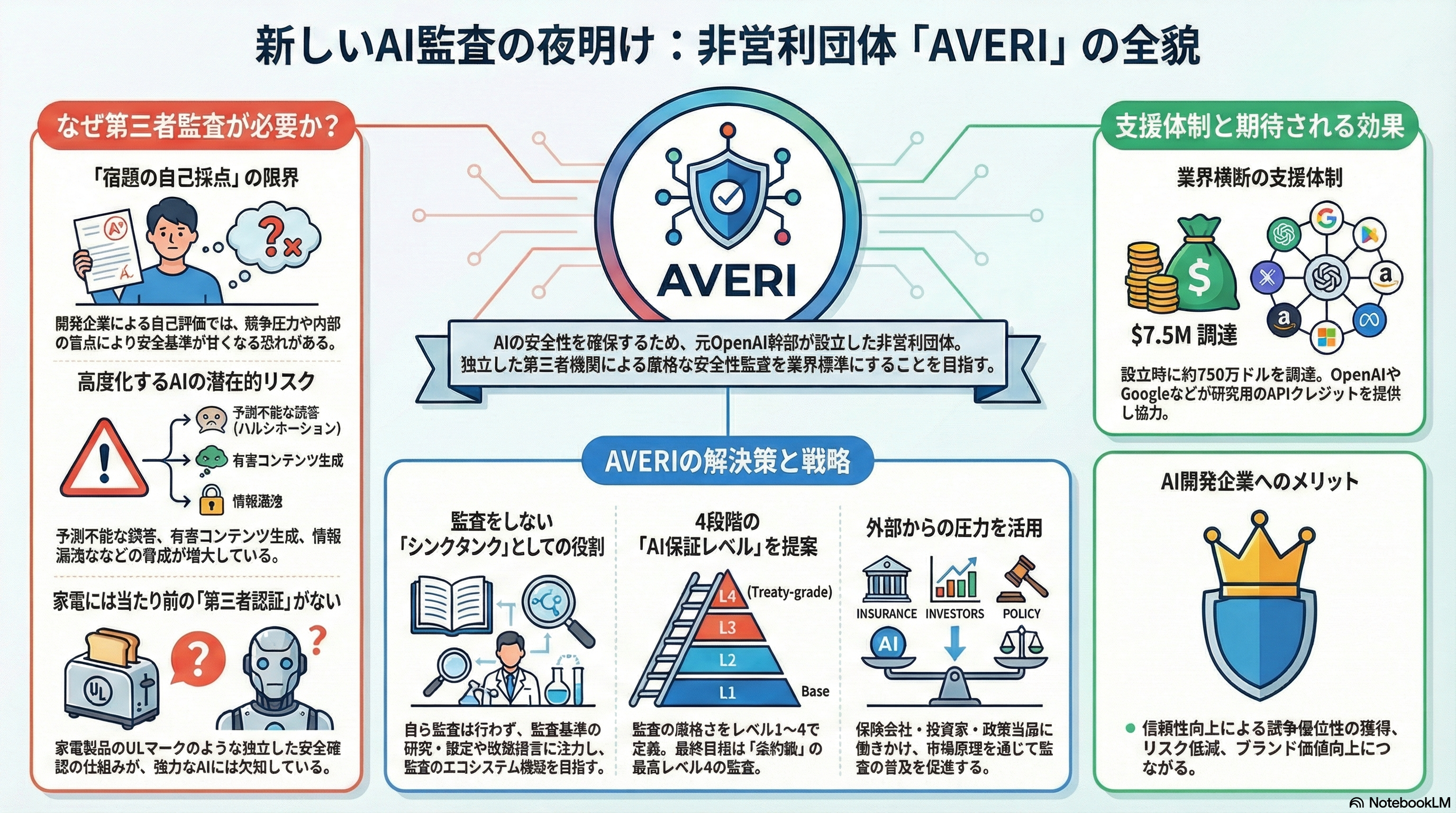 AVERIは先端AIシステムの安全性・セキュリティに関する第三者評価と監査の実施を訴える組織で、AI企業自身が自らの安全対策を評価する「自己採点」ではなく、中立的な外部監査を行う仕組みを推進する。AVERIは独自の監査フレームワーク(AI Assurance Levels)を提案しており、AIシステムとその開発プロセスが一定水準の安全・信頼性基準を満たしているかを第三者が検証する仕組みの標準化を目指す。