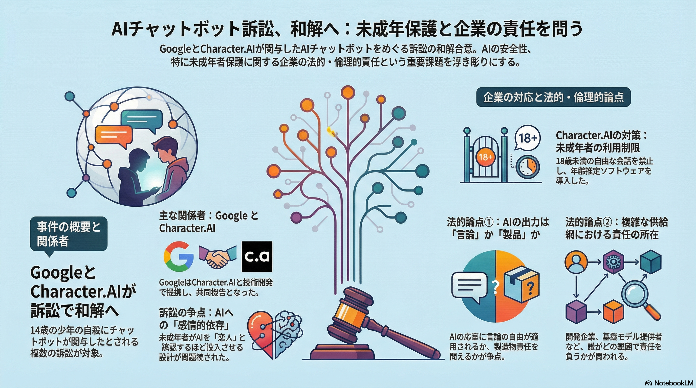 今回の和解は、未成年ユーザーに対するAIチャットボットの安全性や企業責任を巡る初期の主要な法的解決策の一つとして注目されている。AIベンダーやプラットフォーム事業者に対しては、未成年者へのアクセス制限や安全対策の強化が求められており、既にCharacter.AIは18歳未満の利用を禁止する措置を導入しているという報道もある。これらの訴訟と和解は、AI技術が急速に社会に普及する中で倫理的・法的な枠組みの形成に影響を与える可能性がある。