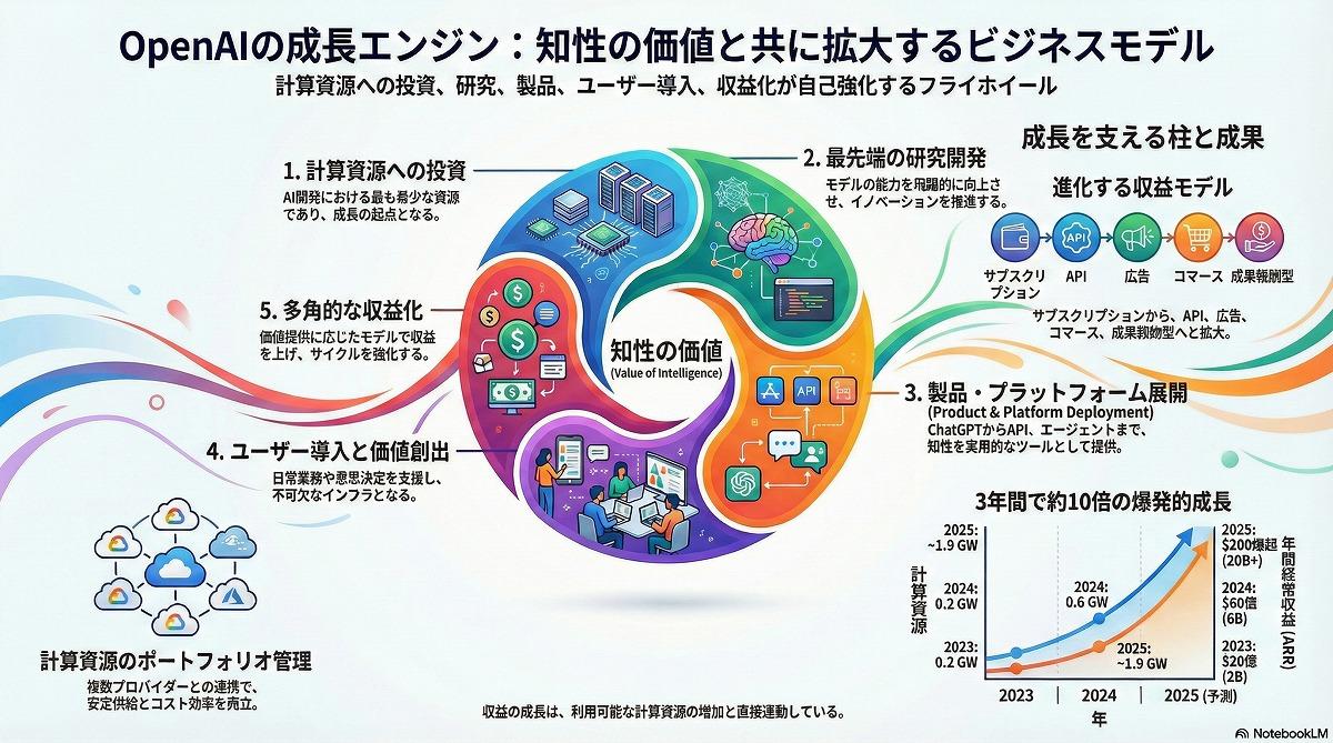 公式発表では、2023年から2025年にかけてコンピューティング能力(GW)が約0.2から約1.9へと約9倍に拡大し、ARRも同期間で約2億ドルから20億ドル超へと10倍以上に増加したことが示された。この「フライホイール」効果は、計算資源への投資、研究開発、製品力、収益化が好循環を生む構造として説明されている。