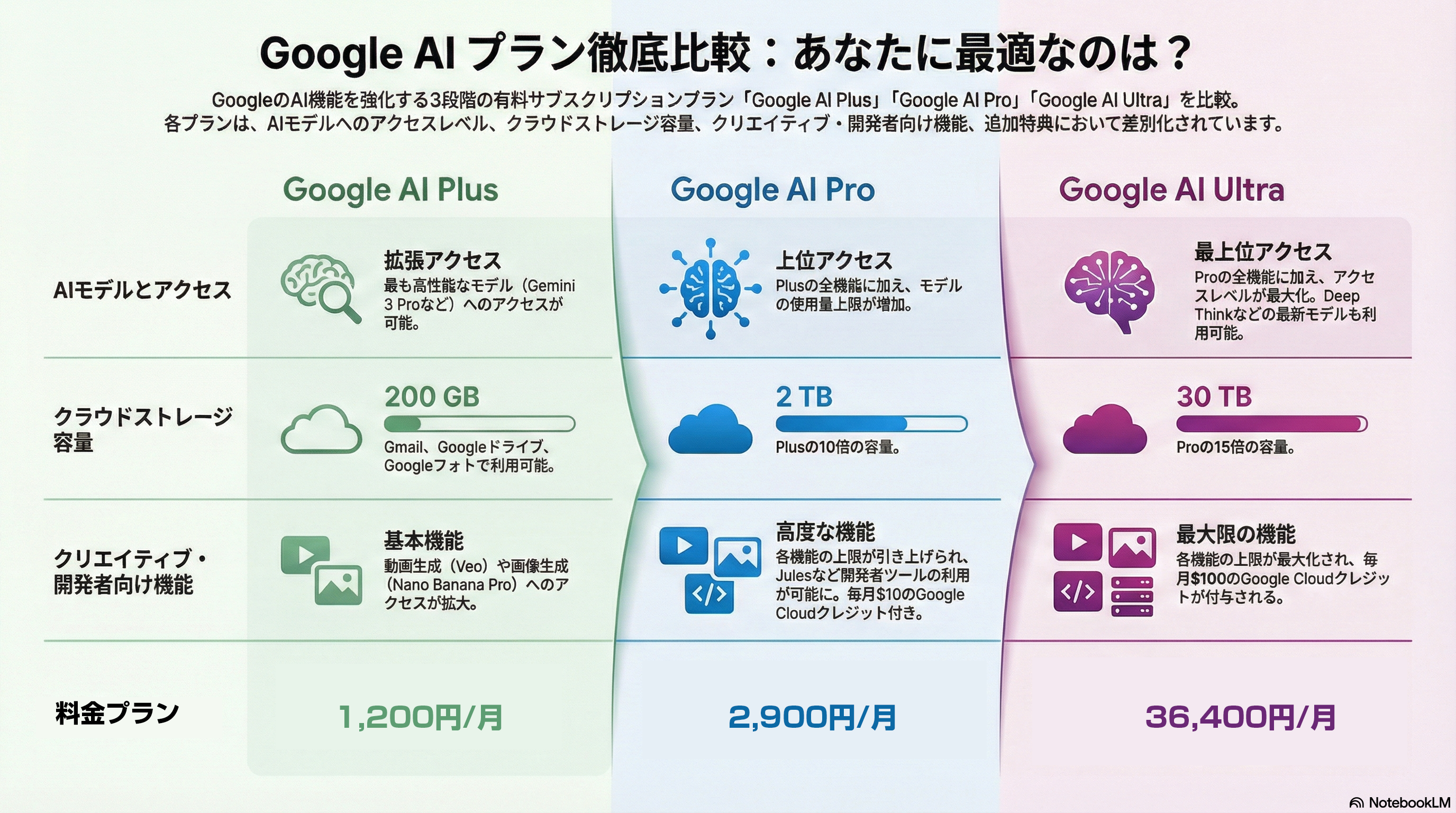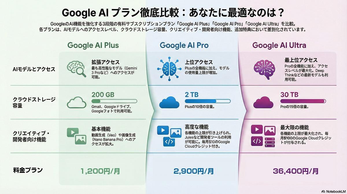 「Google AI Pro」は、Geminiの高性能モデル(例:Gemini 2.5 Pro)へのアクセスに加えて、2TBのクラウドストレージ、より多くのAIクレジット、NotebookLM(AIノート機能)、動画生成など幅広いAI支援ツールが含まれる標準的な有料プランとして位置づけられている。一方、「Google AI Ultra」はさらに上位に位置し、最先端モデルへのアクセス上限が広く、膨大なストレージや追加的なAI機能まで含むプロフェッショナル向けパッケージとなっている。