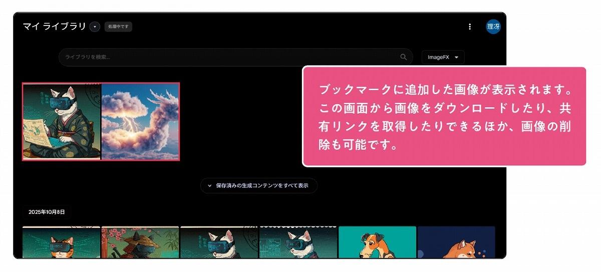 ImageFXで生成した画像は、すべて「Labs.google/fx」のマイライブラリに保存されます。マイライブラリにアクセスするには、画面左上の「ImageFX」→「マイライブラリ」をクリックします。ブックマークに追加しておくと、その画像はマイライブラリのいちばん上に表示されます。
