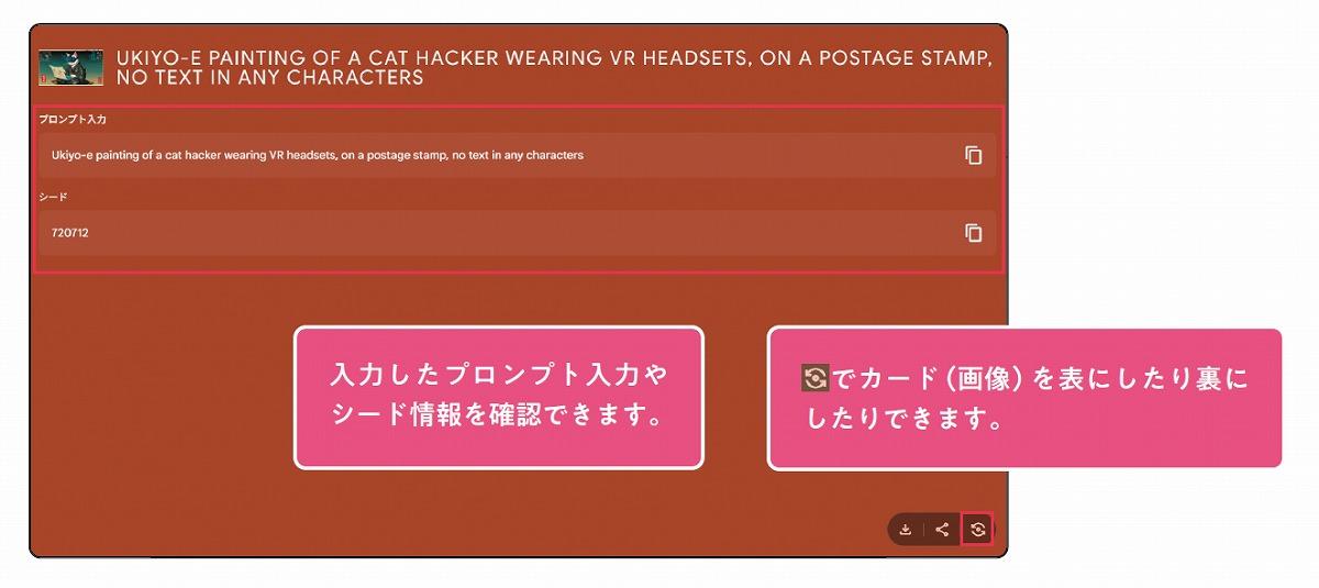 また、画像をクリックし、下図右下の赤い四角をクリックすると、カードの裏面から入力したプロンプトやシード情報などを確認できます。
