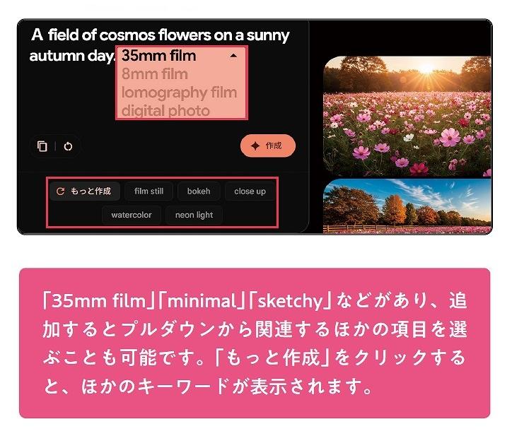 プロンプト入力欄の下部には、Expressive Chips(エクスプレッシブ・チップ)のキーワードが候補として表示されており、クリックすることでプロンプトに追加できます。全体のトーンやスタイルを一括で変更したいときに便利です。