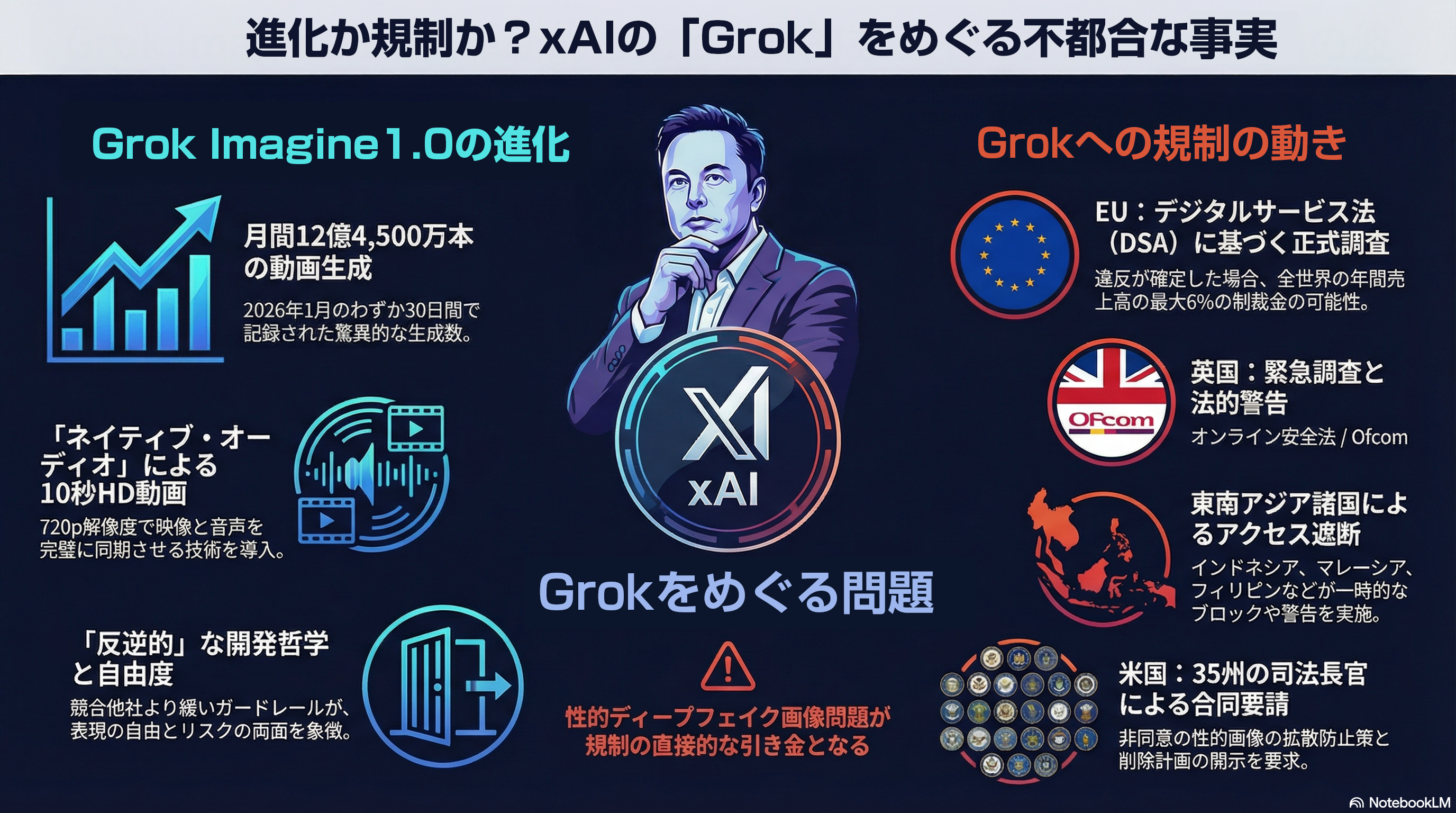 一方で、Grokを巡っては、SNS「X」に統合されたGrokによって、実在の人物を元に性的な画像が生成されたり、本人の同意が確認できないコンテンツを生成した事例が複数報告されるなど、各国で問題視されてきた。xAIは問題の拡大を受け、Grokの性的画像を生成する機能に制限をかけるなどの対応を行ったが、被害当事者や人権団体は、生成AIによる性的ディープフェイクが名誉やプライバシーを侵害すると訴えている。米国内でもカリフォルニア州知事もxAIの責任を追及する構えをみせるなど問題は拡大している。欧州連合(EU)では、デジタルサービス法(DSA)やAI規制法案の枠組みの中で、プラットフォーム事業者に対し違法・有害コンテンツの迅速な削除と再発防止策を求めており、X上の生成AI機能も監督対象とされている。英国やフランスでは、非合意の性的画像生成を刑事罰の対象とする法整備が進み、生成AI事業者に安全設計を求める声が強まっている。