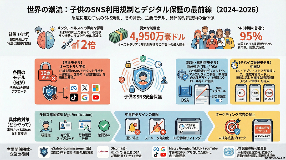スペインの取り組みは、国際的な流れの一部として位置付けられる。世界各国では子どものオンライン安全を守るため、SNS利用年齢の引き上げや利用制限を進める動きが加速している。