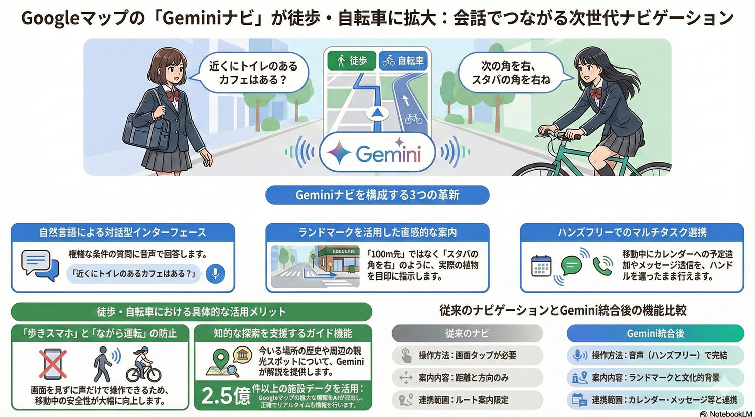 Google マップの「Geminiナビ」が徒歩・自転車にも対応