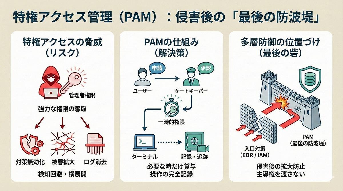 PAMは、こうした強い権限の使われ方を縛り、権限を持たせっぱなしにしない。申請と承認を通じて、作業の間だけ権限を付け、終われば外す。鍵の貸し出しに近い。誰がいつどの端末に入り、何をしたかも記録し、後から追える状態をつくる。侵害後に攻撃者が動ける時間と範囲を小さくし、被害の広がりを遅らせる狙いがある。