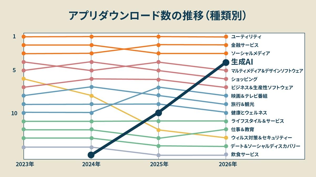 米データ調査のVisualCapitalist.comのレポートによれば、AIアプリは2024年に10位以内にも入れず、15位にとどまっていた。これが2025年には10位に浮上。2026年には1位の生産性アプリ、2位の金融サービス、3位のソーシャルメディア(SNS)に次ぐ4位に上昇すると予想される(図2)。