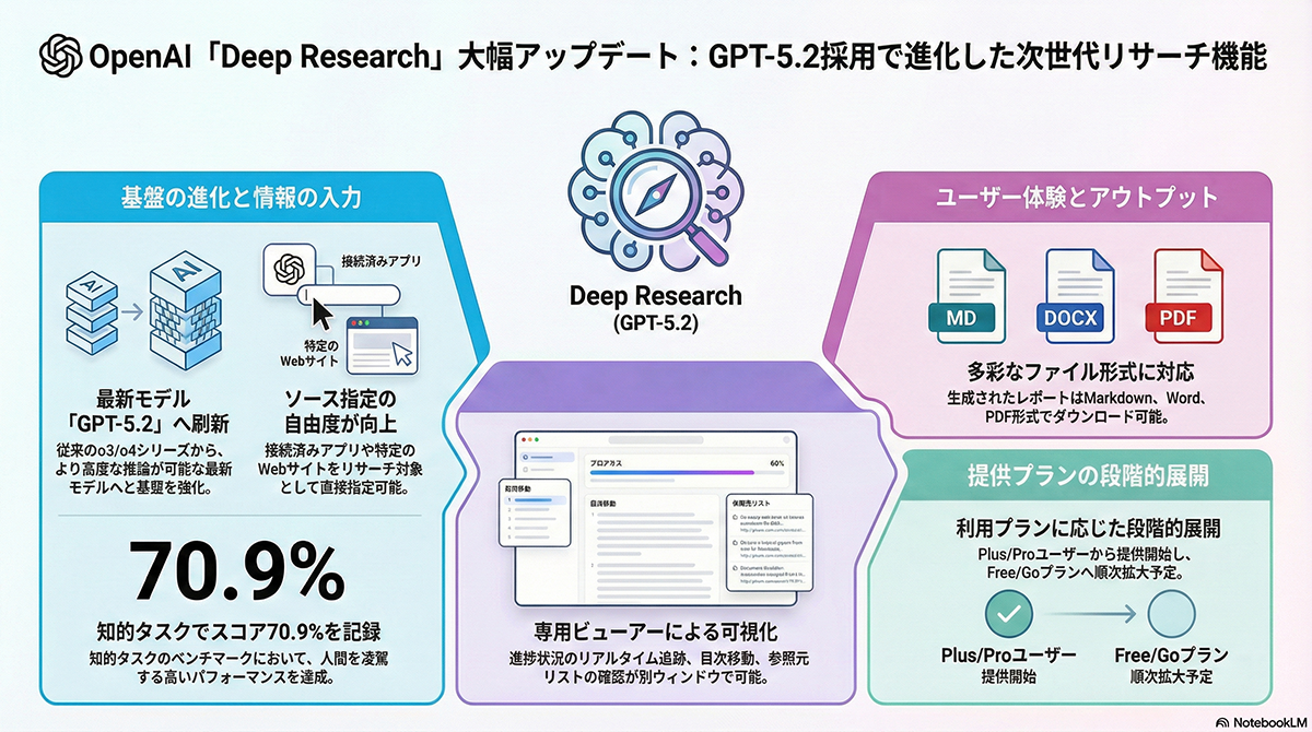 公式発表では、GPT-5.2の導入によって長文の読解や複雑なテーマに関する推論の精度が向上したことも説明された。特に、多段階の調査や情報整理を伴う業務シナリオにおいて、一貫性のある出力を実現するとしている。また、生成結果における参照元の明確化や、調査過程の透明性確保にも配慮した設計であることが示された。