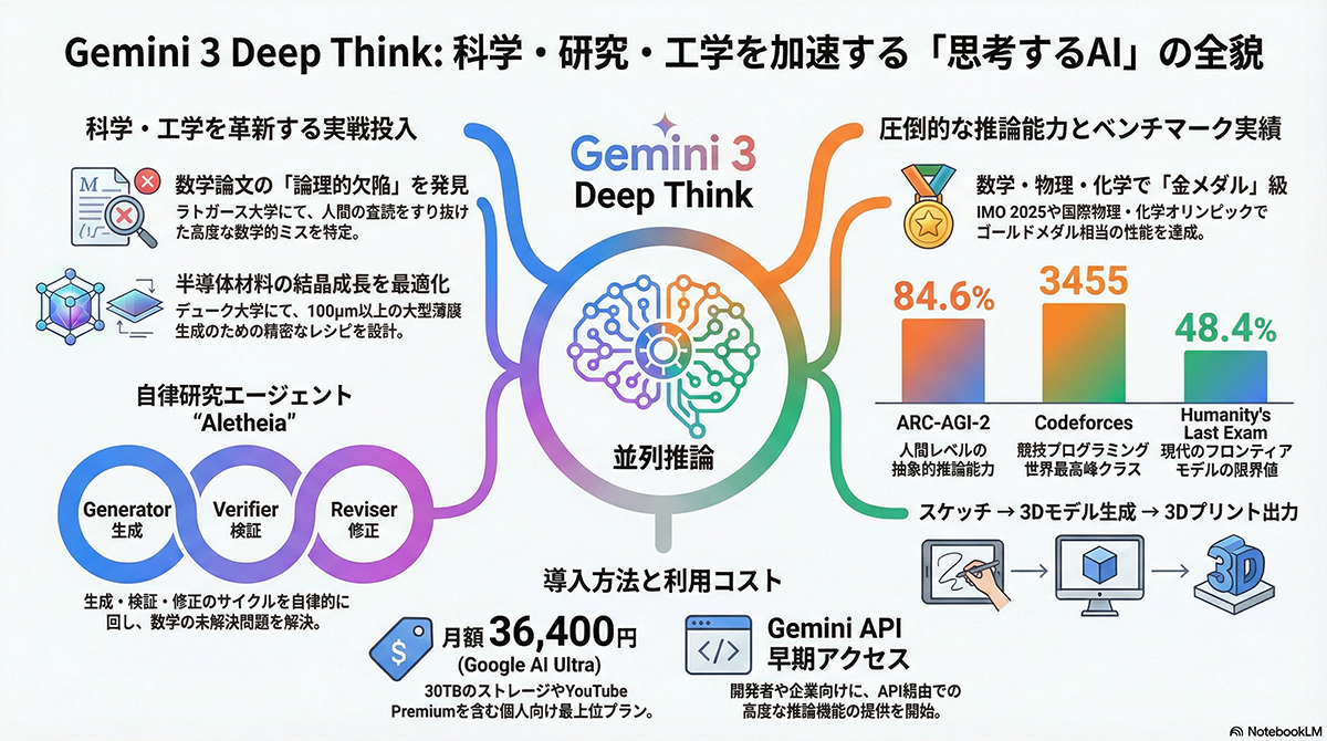 性能評価(ベンチマーク)においても、Deep Thinkは複数の指標で記録的なスコアを達成した 。難易度の高い推論ベンチマーク「ARC-AGI-2」で84.6%を記録したほか、現代の最先端モデルの限界をテストするために設計された「Humanity's Last Exam」においても48.4%という新基準を打ち立てた 。また、Google DeepMindはこの技術を基盤とした数学研究エージェント「Aletheia(アレテイア)」を開発し、国際数学オリンピックレベルの問題解決のみならず、実際の学術研究における未解決問題の証明や論文生成に自律的に成功したことも明らかにしている。