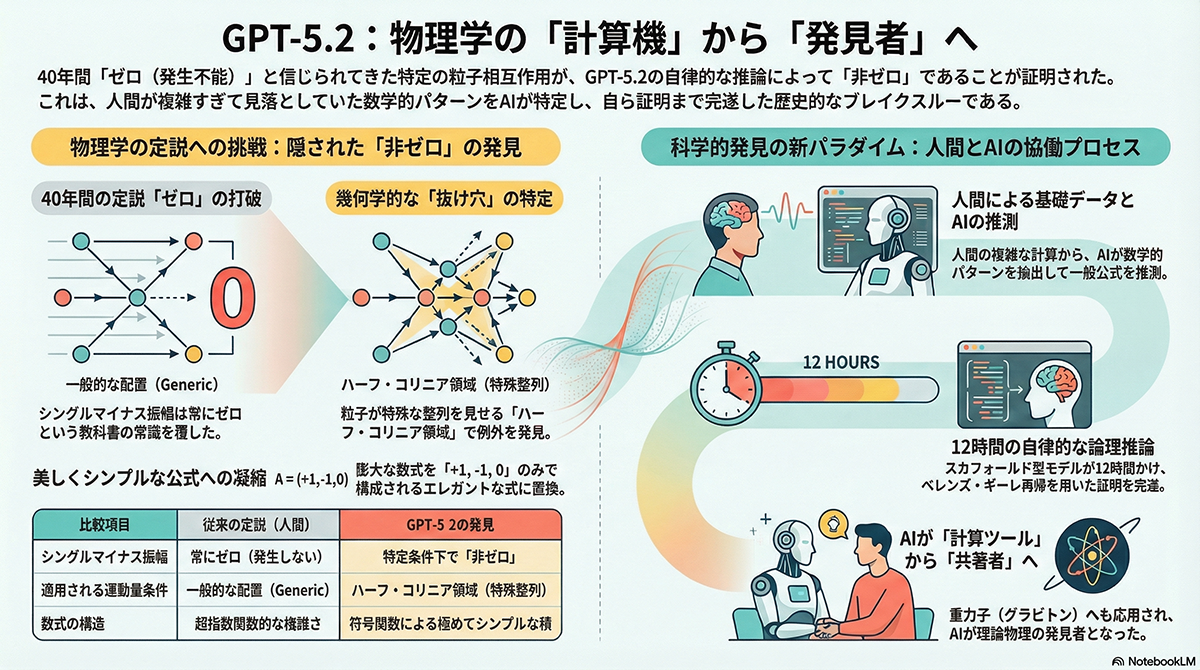 この発見プロセスにおいて、GPT-5.2は単なる計算機以上の役割を果たした。まず、GPT-5.2 Proモデルが、人間が計算した複雑な数式を劇的に簡略化し、そこに潜むパターンを特定して一般公式を「推測(Conjecture)」した。続いて、内部の推論強化モデルが約12時間にわたる自律的な思考を行い、その公式が正しいことを数学的に「証明(Proof)」した。AIが仮説の立案から厳密な証明までを一貫して行った点は、従来の科学研究支援AIとは一線を画す成果だ。