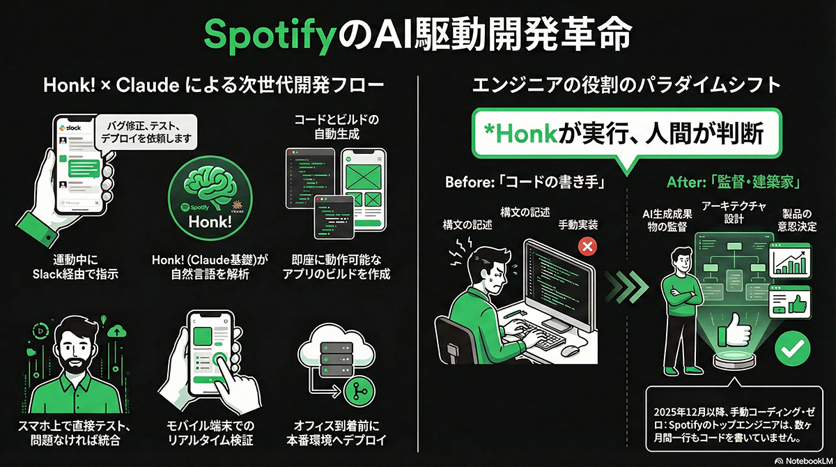 決算説明会での報告によると、SpotifyはAnthropic社のAIモデル「Claude」を活用した社内システム「Honk」を導入し、開発プロセスを大幅に自動化している。セーデルストロム氏は具体的な事例として、エンジニアが通勤中にスマートフォンからSlack経由で「Honk」に指示を出し、バグ修正や新機能の実装を行っている状況を紹介した。AIがコードを生成し、エンジニアがモバイル端末上で確認した後、オフィスに到着する前に本番環境へデプロイ(展開)することが可能になっている。この開発体制の移行により、Spotifyでは製品開発のスピードが劇的に向上した。2025年だけで50以上の新機能やアップデートをリリースしており、その中にはAIを活用したプレイリスト作成機能や、オーディオブック向けの「Page Match」などが含まれる。セーデルストロム氏は「最も経験豊富なエンジニアたちは、12月以降、一行もコードを書いていない」と述べ、彼らの業務が「コードを書くこと」から「AIの出力をレビューし、アーキテクチャを設計すること」へシフトしたと説明した。