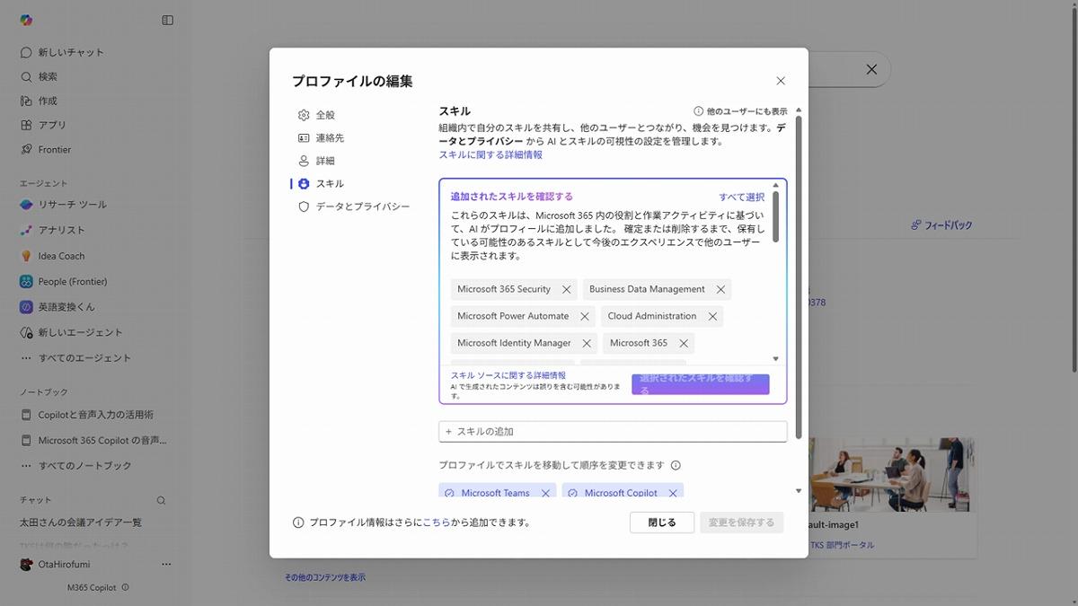People Skillsが有効になると、AIがMicrosoft 365内のユーザーのアクティビティ情報を用いてスキルを推論してタグ付けをします。推論対象には、ユーザーそれぞれのドキュメントやメール、チャット、会議などが含まれます。ユーザーは自身のプロフィール編集画面から、AIによってタグ付け提案されたスキルを確認できます。ここではさらに、ユーザーが自身でもスキルの追加・削除などの編集を行うことができます。