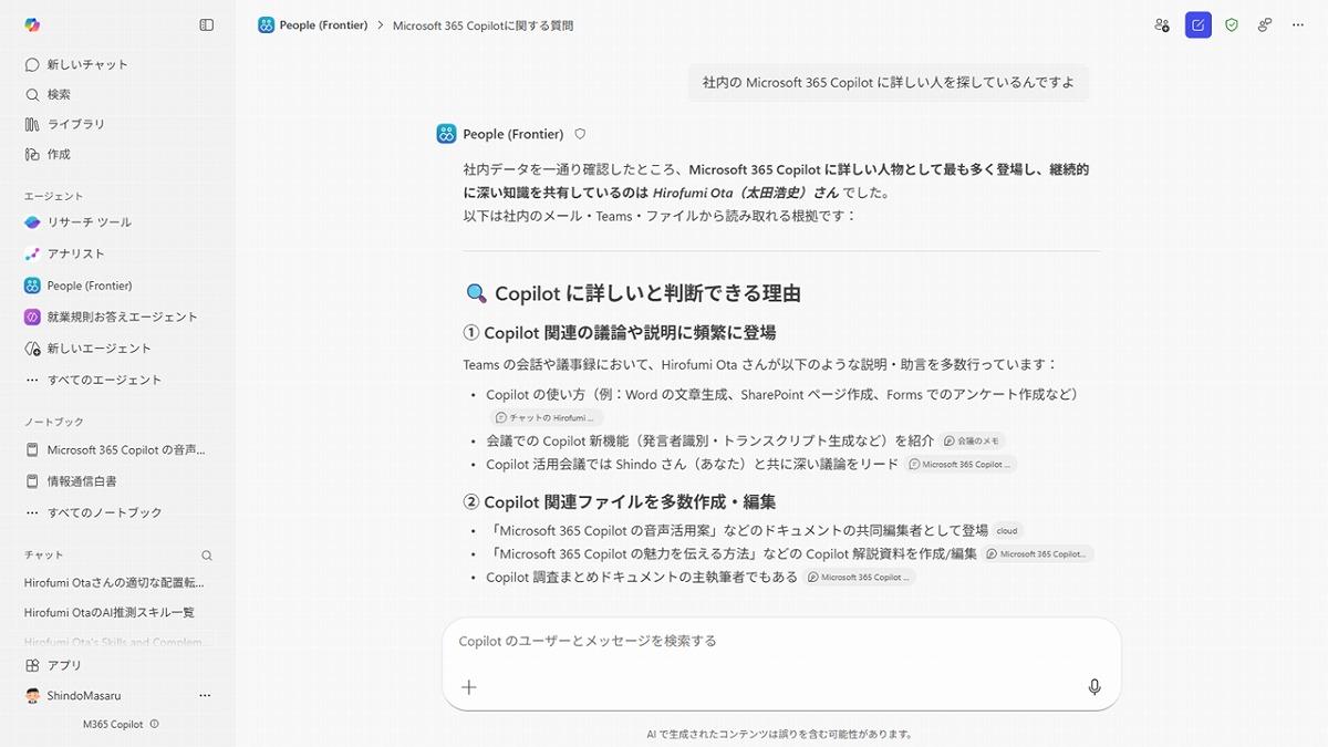 使い方は難しくありません。Microsoft 365 Copilot ChatでPeopleエージェントを追加し、「どんな知識やスキルを持つ人を探しているか」を自然文で尋ねるだけです。たとえば「社内でMicrosoft 365 Copilotについて詳しい人はいる?」などと聞くと、Copilotに関するドキュメントを多く作成し共有している人などを見つけて教えてくれます。