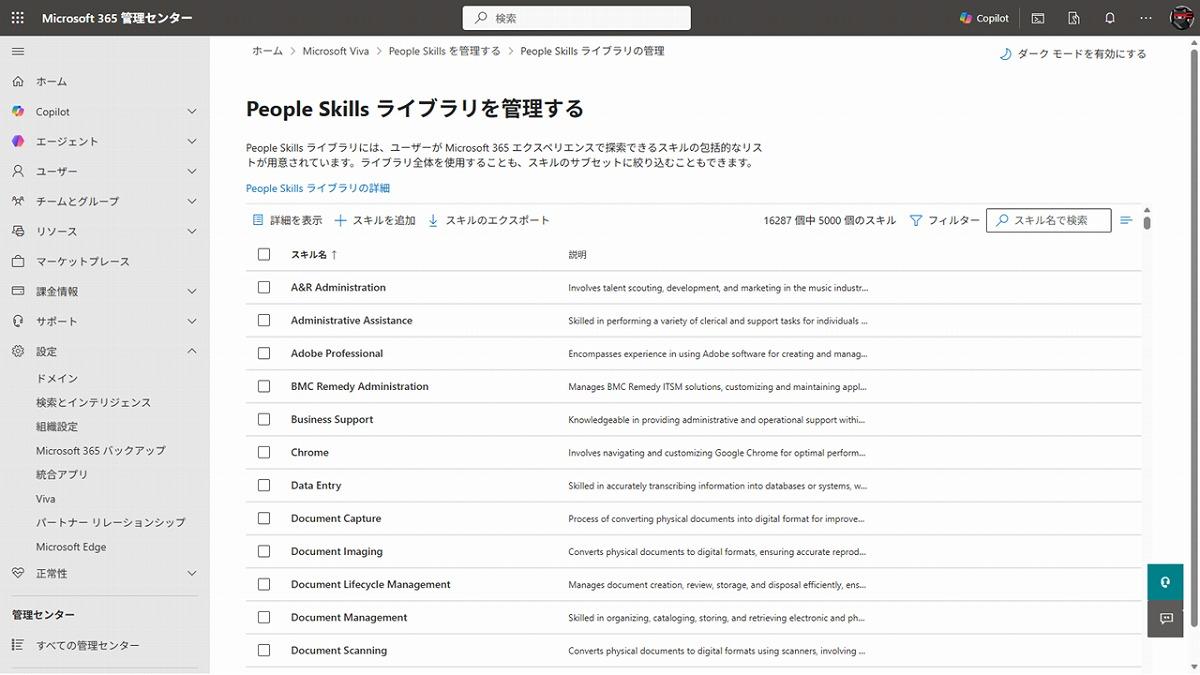 管理者はPeople Skillsを有効化し、スキルの分類を管理します。すべて自前で用意しなくても、既定のスキルライブラリには1万6000を超えるスキルが登録されており、ここから利用を開始することができます。ただし、スキル名が英語表記である点が、日本のユーザーとしては導入時の課題の1つになりそうです。