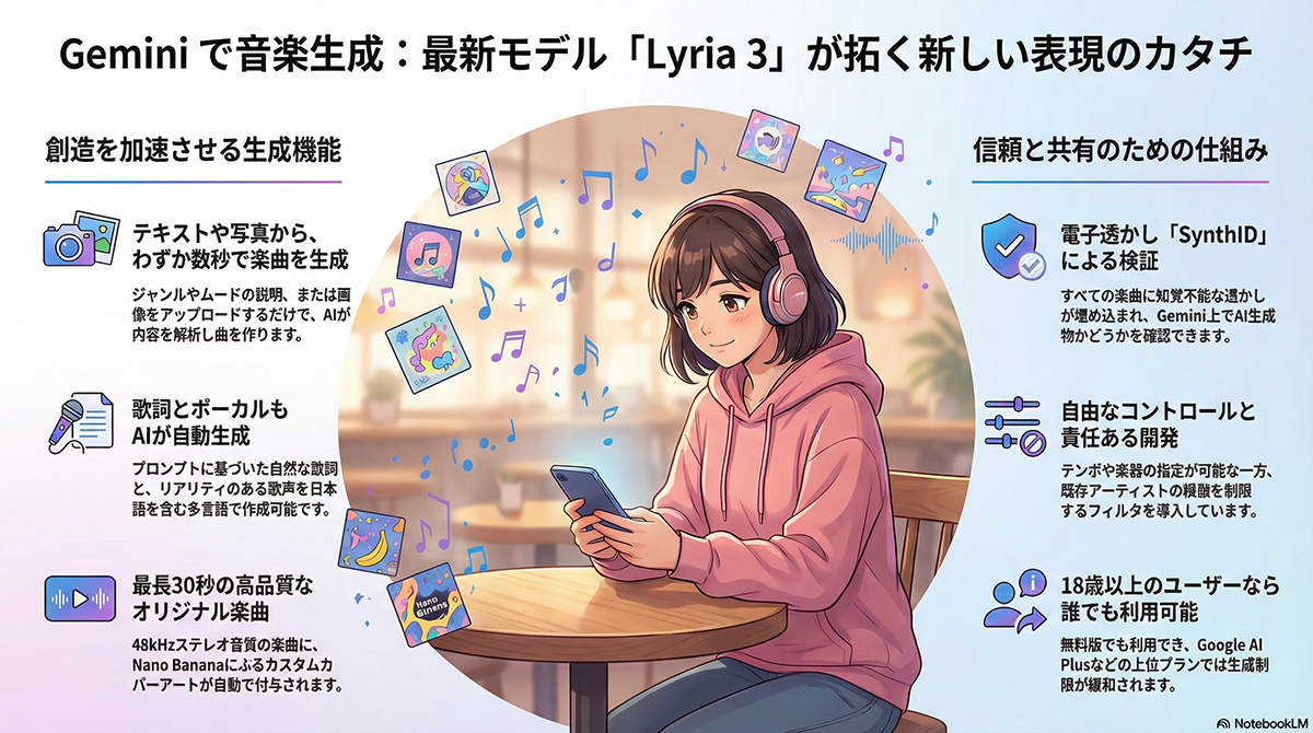 「Lyria 3」は48kHzのステレオ出力に対応しており、従来よりも自然な歌声と複雑な楽器構成を持つ楽曲を生成できる。同時に、生成AIによるコンテンツの安全性と著作権保護の仕組みも強化された。生成された全ての楽曲には、AIによる生成物であることを識別するための電子透かし技術「SynthID」が埋め込まれる。特定の既存アーティストの直接的な模倣を避ける設計がなされており、生成された出力と既存の楽曲を照合するフィルター機能も備えられている。