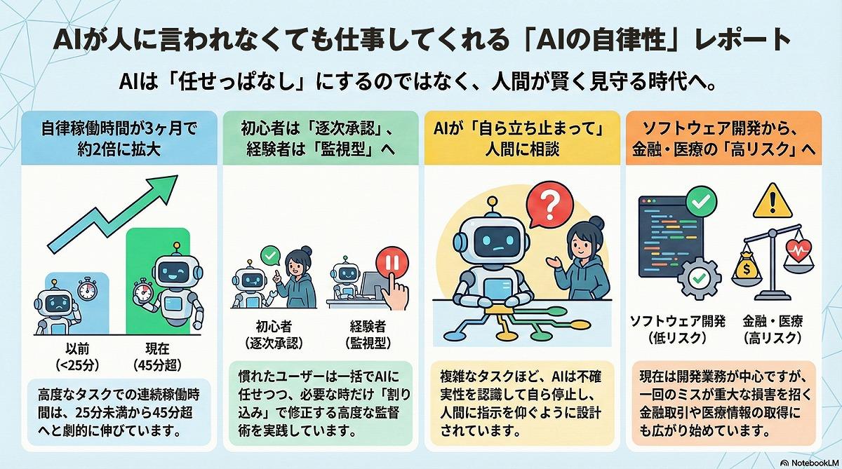 しかし、金融取引の自動実行や医療情報の取得など、高リスクかつ高い自律性を伴う領域での利用事例もごく一部で確認されている。同社はこれらの事例の一部に性能評価目的のテストが含まれると指摘しつつ、今後は多様な分野でAIエージェントの本格的な活用が進み、リスクを伴う領域での利用が増加すると予測している。こうした状況を踏まえ、実運用データに基づく継続的な稼働監視と、人間が適切にAIを監督できる仕組みの構築が求められている。
