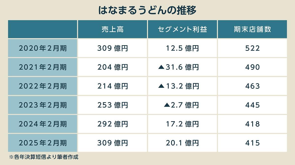 コロナ禍では業績が悪化し、はなまる事業は3年連続で赤字となった。はなまるうどんが得意とするのは駅前やオフィス街、施設内などで、地方でも商業施設内に出店することが多かった。人流が郊外に流れる中、都市部偏重のはなまるは苦戦し、店舗数は5年間で約100店舗減少した。
