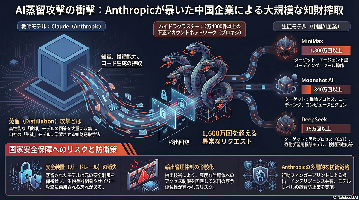 Anthropicの報告によると、これら3社は同社の利用規約および中国からのアクセスを制限する地域的ブロックを意図的に回避した。具体的には、商用のプロキシサービスや非公認の転売業者を利用して身元を偽装し、約2万4000件の不正アカウントのネットワークを構築した。そして、Claudeに対して1600万回以上に及ぶプロンプト送信を実行し、モデルの能力を抽出した。