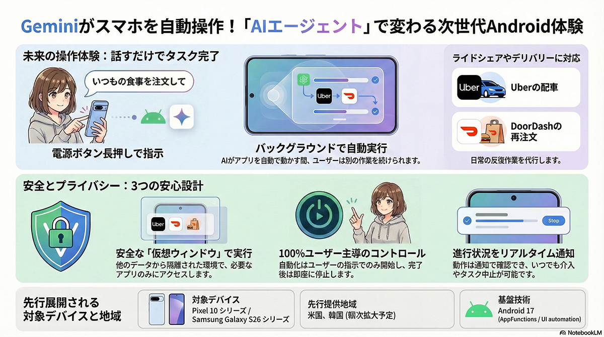 配車アプリやフードデリバリーアプリの操作をAIがバックグラウンドで代行、Pixel10とGalaxyS26で米国と韓国から