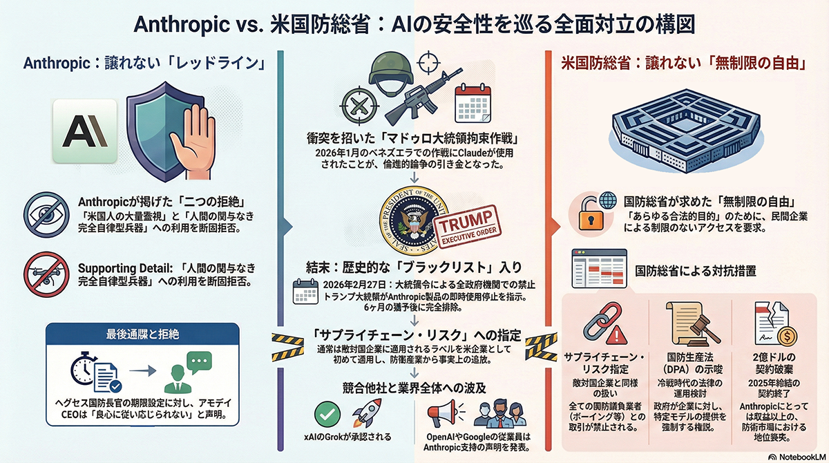 事の発端は、米国防総省とAnthropicの間で生じた軍事利用に関する安全基準の対立である。ピート・ヘグセス国防長官は同社に対し、軍が合法と判断するすべての用途においてAIモデルを無制限に利用できるよう、安全対策の制限を解除することを要求した。これは、自律型の致死兵器システムや大規模な監視活動へのAI転用を防ぐ目的で同社が設けている倫理的セーフガードの完全な撤廃を意味する。国防総省は2月27日午後5時1分を最終期限として要求の受け入れを迫った。