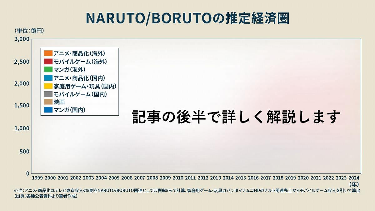 とりわけ当時のジャンプをけん引していたのが、『ONE PIECE』と『NARUTO』という二大看板であり、『NARUTO』はその一角を担っていた。ここからは、作品が生み出した関連売上の規模を試算しながら、『NARUTO』のIPとしての実力を分析していきたい。