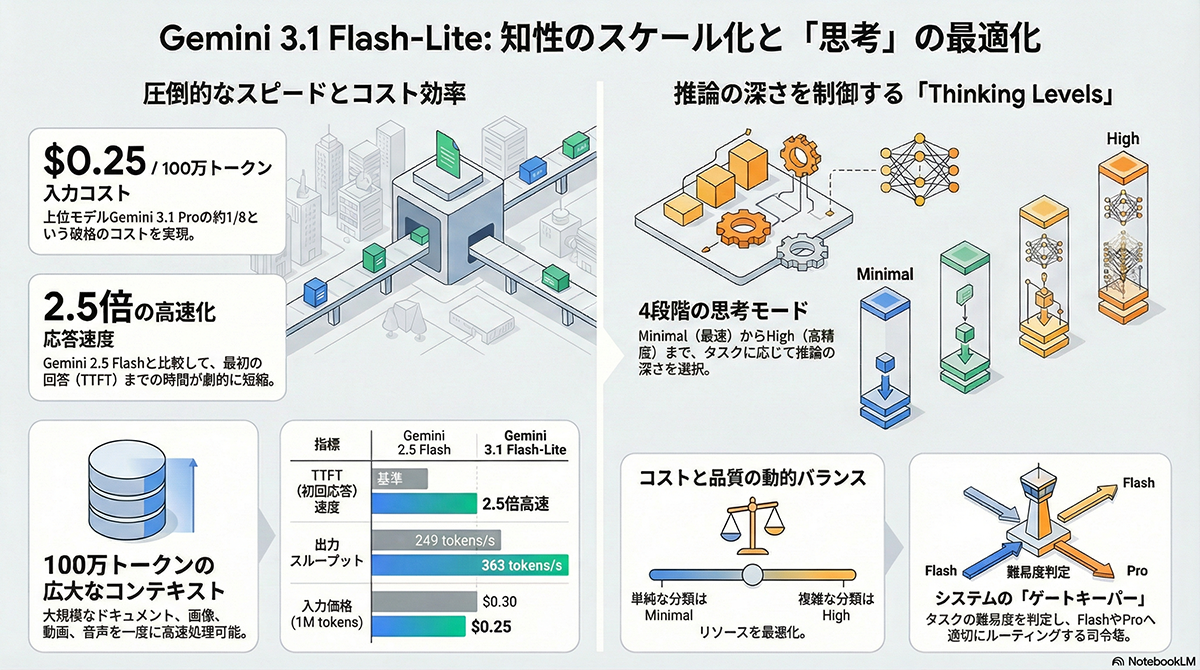 また、GPQA Diamondで86.9パーセント、MMMU Proで76.8パーセントを記録し、前世代のより大規模なGemini 2.5 Flashを上回る性能を示した 。新たな機能として、タスクに応じてモデルの推論の深さを制御できる思考レベル機能が標準で追加された 。開発者はAI StudioやVertex AI上で、処理ごとにAIが推論にかける思考量を柔軟に調整できる 。