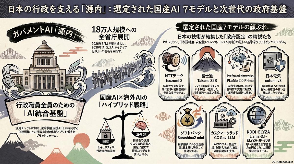 選定されたのは、NTTデータのtsuzumi 2、KDDIとELYZAによるLlama-3.1-ELYZA-JP-70B、ソフトバンクのSarashina2 mini、日本電気のcotomi v3、富士通のTakane 32B、Preferred NetworksのPLaMo 2.0 Prime、カスタマークラウドのCC Gov-LLMの7モデルである 。これらの国産モデルは日本語の語彙や表現への適合性が高く、法令用語や公文書特有の厳密性に対応しやすい特徴を持つ。