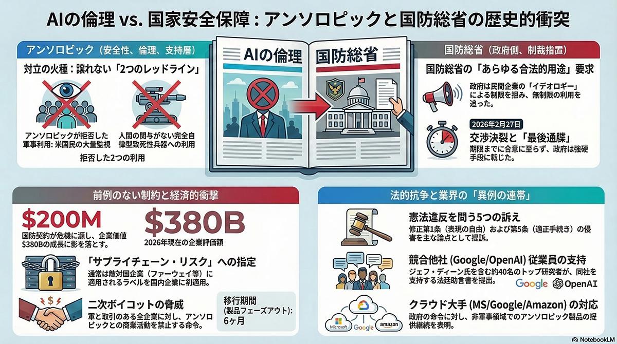 AIスタートアップの米Anthropicは、自社が米国のサプライチェーンにリスクをもたらすと米国防総省から認定された措置の取り消しを求め、サンフランシスコの連邦地裁に提訴した。国防総省はAnthropicに対し、軍がAIモデル「Claude」をあらゆる合法的用途で制限なく利用できるよう要求していた。これに対しAnthropicは、国家安全保障に関わる大半の利用に同意し軍事用途向けモデルを提供しつつも、2つの特定の用途に対する利用を明確に拒否した。