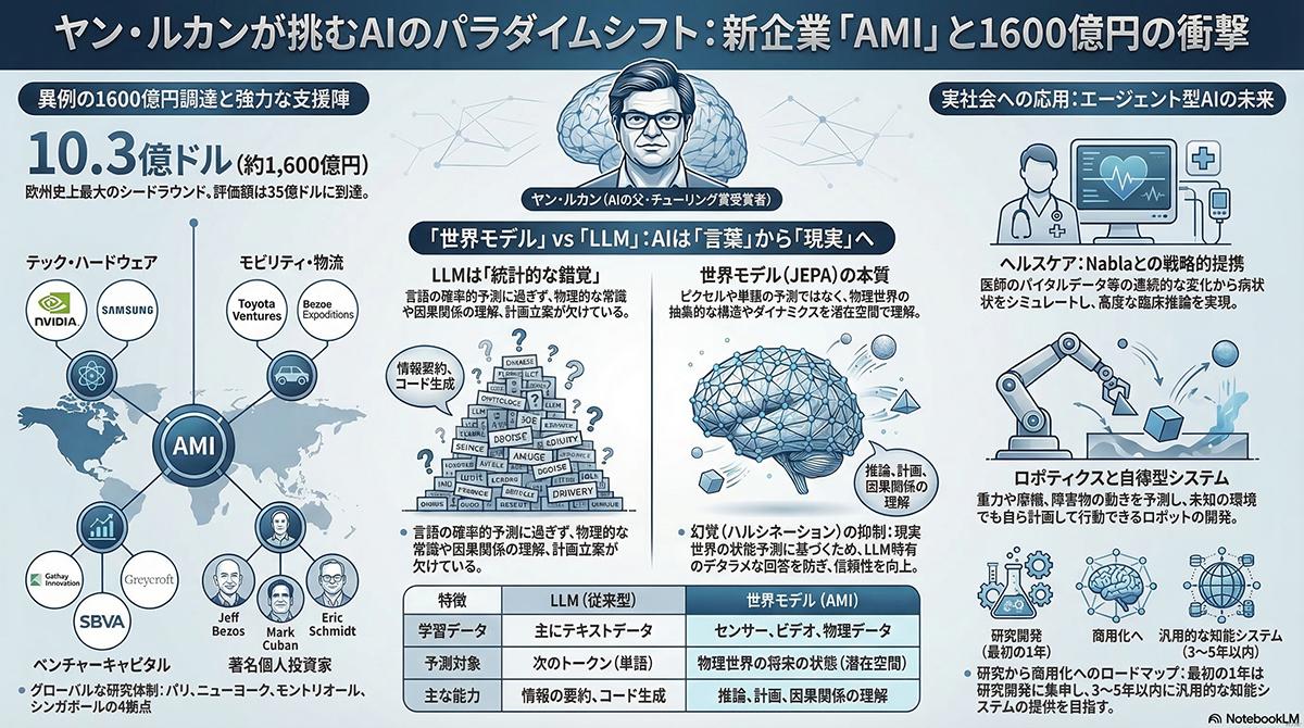 人工知能(AI)研究の第一人者として知られるヤン・ルカン氏が率いる新興企業、仏Advanced Machine Intelligence(AMI)が、10億3000万ドル(約1617億円)の資金を調達したことが2026年3月10日に明らかになった。シードラウンドの資金調達としては欧州で過去最大規模となり、同社の評価額は資金調達前で35億ドルに達する。仏ベンチャーキャピタルのキャセイ・イノベーションや米グレイクロフトが今回の調達を主導した。さらに、半導体大手の米エヌビディア、トヨタ自動車傘下のトヨタ・ベンチャーズ、アマゾン創業者のジェフ・ベゾス氏が運営する投資会社ベゾス・エクスペディションズ、韓国のSBVA、シンガポールの政府系ファンドであるテマセクなど、世界各国の企業や投資ファンドが支援に加わっている。