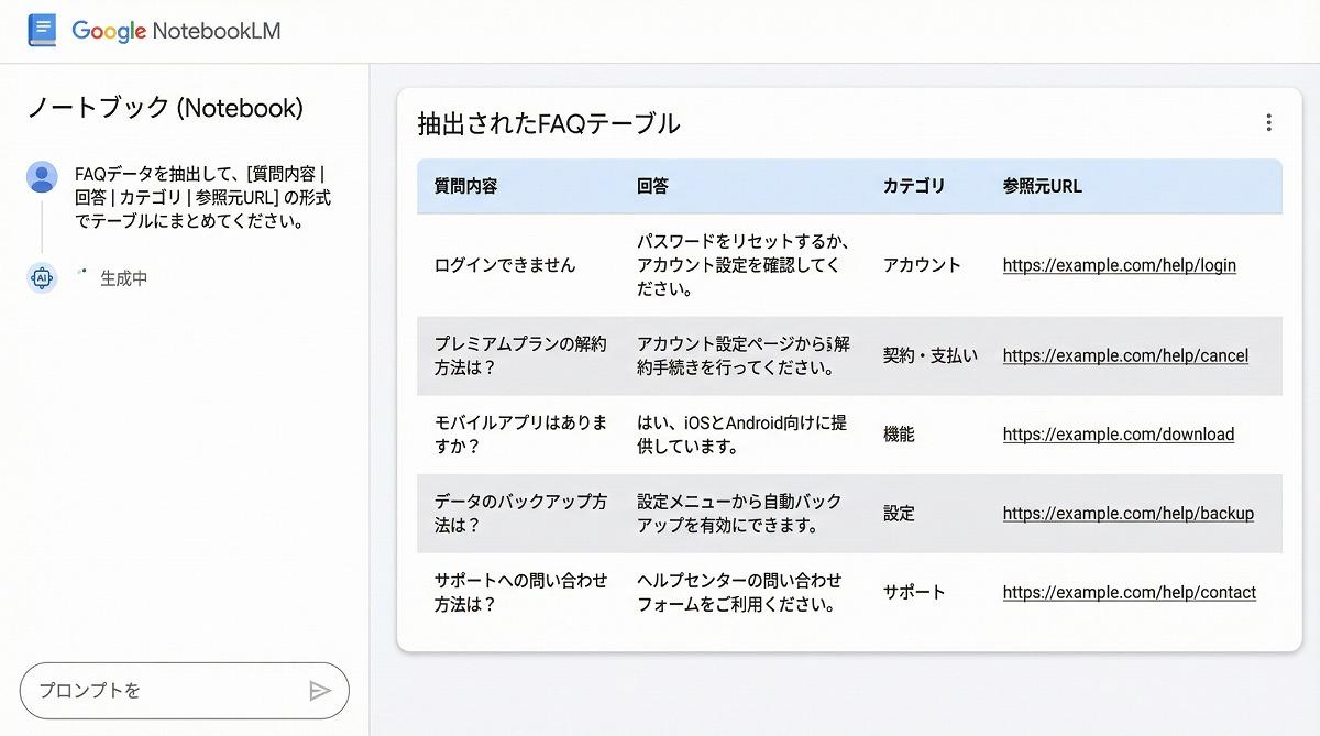 この際「|(パイプ)」などの記号で区切りを指定し、「料金|使い方|トラブル」といったカテゴリ分類を指示に含めることで、AIが表の構造をより正確に認識し、精度の高いテーブルが生成されます。