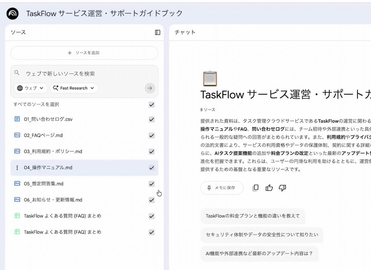 まずは、基となる情報をNotebookLMのソースに追加します。カスタマーサポートのFAQ、社内の利用規約、操作マニュアル、YouTube動画のURLなど、形式を問わず取り込むことが可能です。NotebookLMはこれらの情報を「クローズド」な環境で学習し、外部の不確かな情報に惑わされることなく、純粋にソースに基づいた分析を開始します。