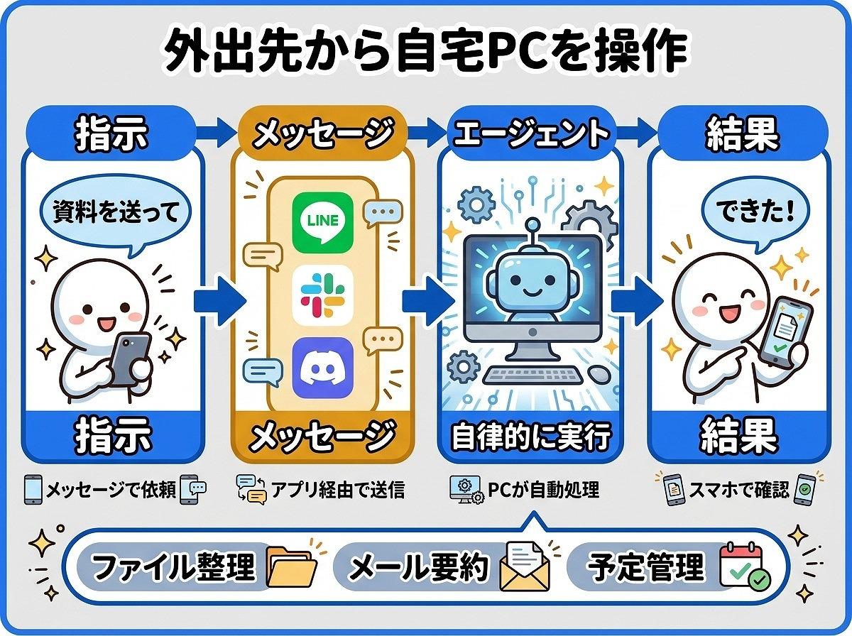 SKILL.mdというMarkdownファイルを追加するだけで新しい能力を獲得する。Gmail連携、ブラウザ自動操作、スマートホーム制御など、コミュニティが作ったスキルが「ClawHub」に2万6000件以上公開されている(3月17日現在)。Claude CodeやCursorのスキルとフォーマットに互換性があり、移植も容易だ。エージェント自身に「このスキルを作って」と頼むこともできる。