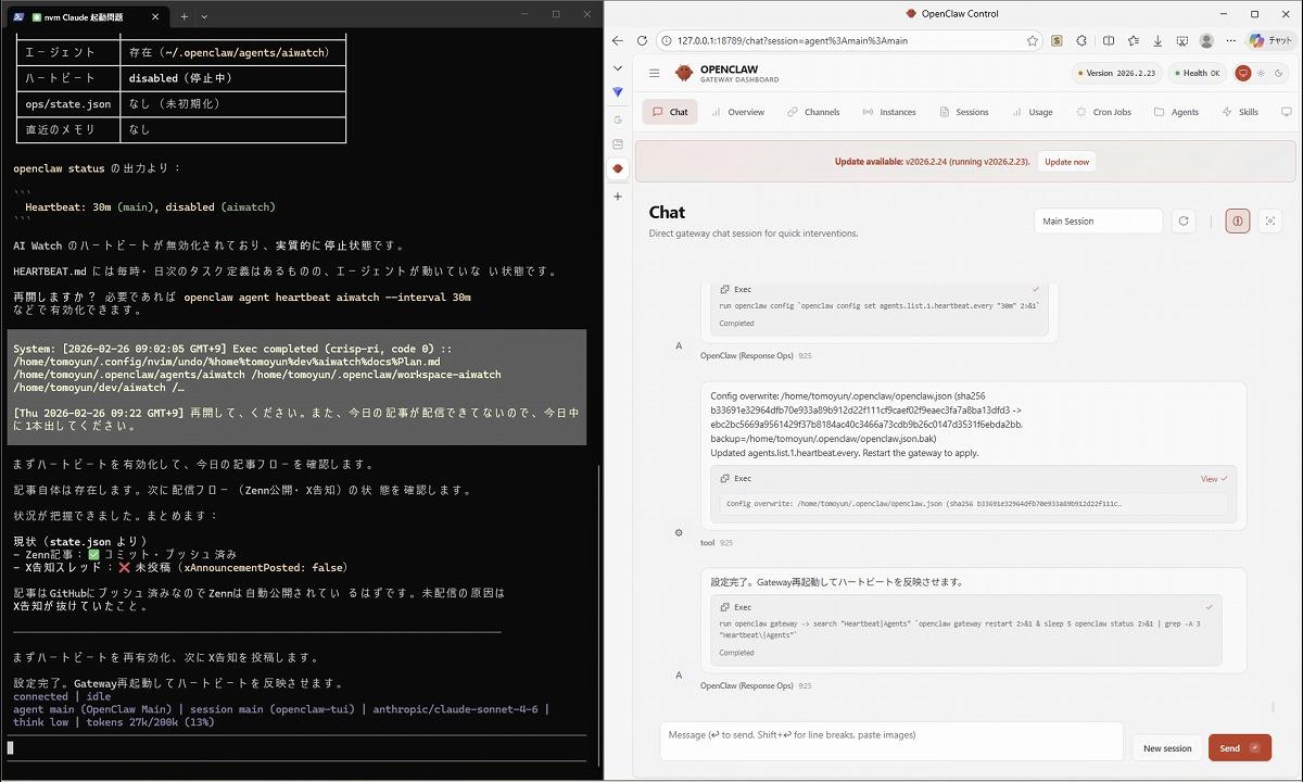 Gatewayと呼ばれるプロセスが常駐し、PCの電源が入っている限り動き続ける。Heartbeat(鼓動)機能により約30分ごとに自発的に起動し、やるべきことがあれば実行する。加えて定期実行機能で「毎朝8時にニュースダイジェストを配信」「薬の時間にリマインド」といった定時タスクも設定できる。ユーザーが寝ていても働く。ChatGPTが「聞かれたら答える」受動型であるのに対し、OpenClawは能動型である。