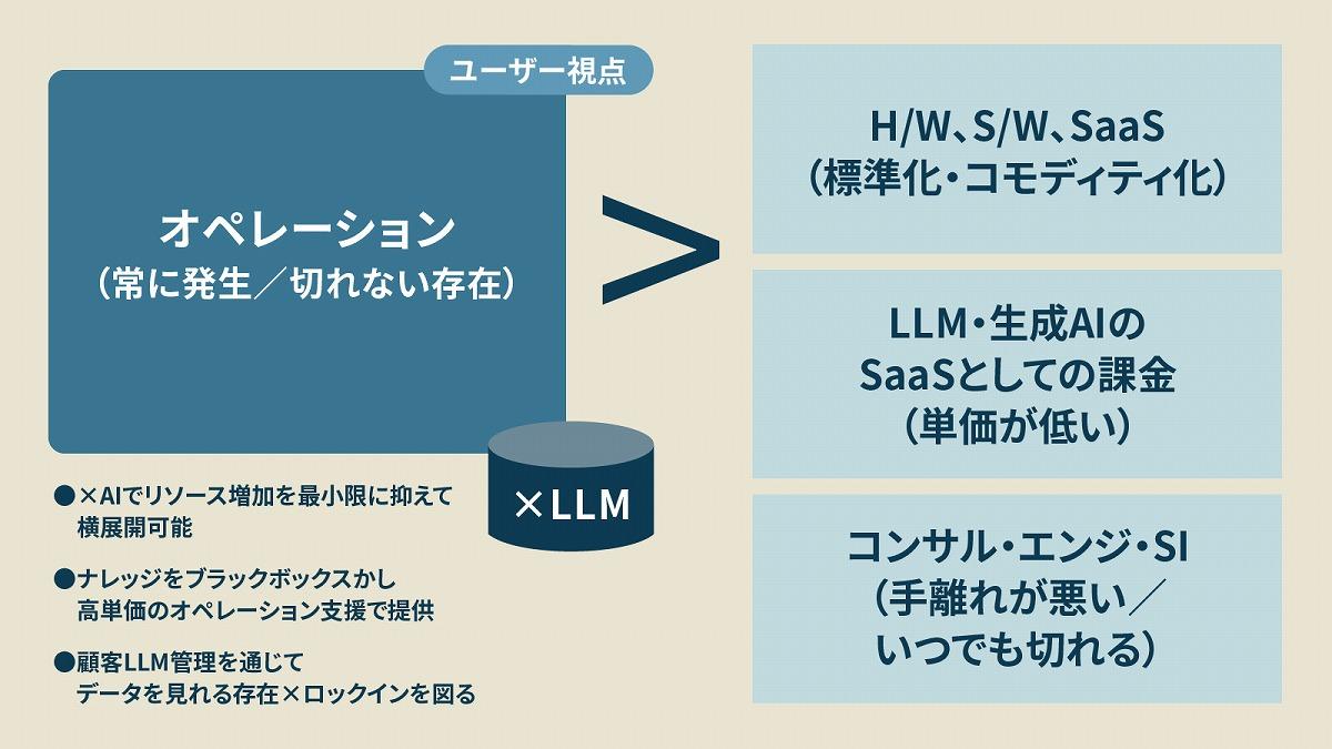 仮に、自社が蓄積してきたノウハウをRAGで参照させたAIソリューションを開発し、それをSaaSとして提供したとしても、最終的には価格が低くなければ導入されにくい。つまり、LLMなどを組み込み商材の機能を強化したとしても、収益を大きく伸ばせる構造にはなりにくいのだ。