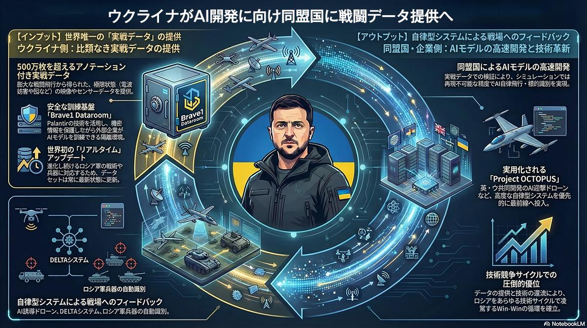 ウクライナのフェドロフ国防相は2026年3月、ドローンをはじめとする自律型システム向けの人工知能(AI)ソフトウェアを訓練するため、同盟国や防衛企業に対して実際の戦場データの提供を開始したと発表した。提供されるデータセットには、ロシアとの4年に及ぶ戦争の過程で収集された数百万枚に及ぶ注釈付き画像や、数万回の戦闘飛行から得られたビデオ映像が含まれる。これらは実験室や演習場では再現できない情報であり、目標衝突直前の回避行動、瓦礫に覆われた都市部での視覚的ノイズ、妨害電波(ジャミング)を受けた際のセンサーの挙動といった極限状態の記録を含んでいる。機密情報の外部漏えいを防ぐため、ウクライナ政府は安全にモデルの訓練とテストを実行できる専用のAIプラットフォームを構築し、兵器製造企業にアクセスを付与する実験的プロジェクトを始動させた。