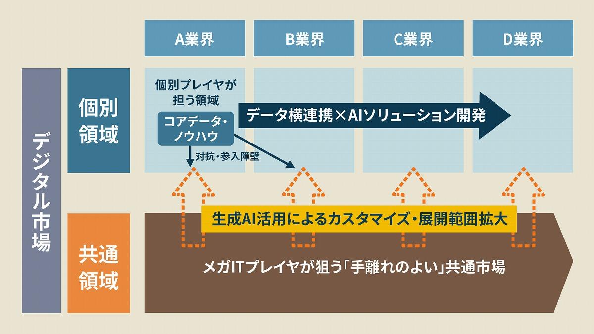 これまでメガITプレイヤーは、業界共通のニーズに対応するような、いわゆる手離れのよい「スケールしやすい市場」を主に担ってきた。そのため、ニッチ課題に対する解決策の提案などにはそれほど手を出してこなかった。