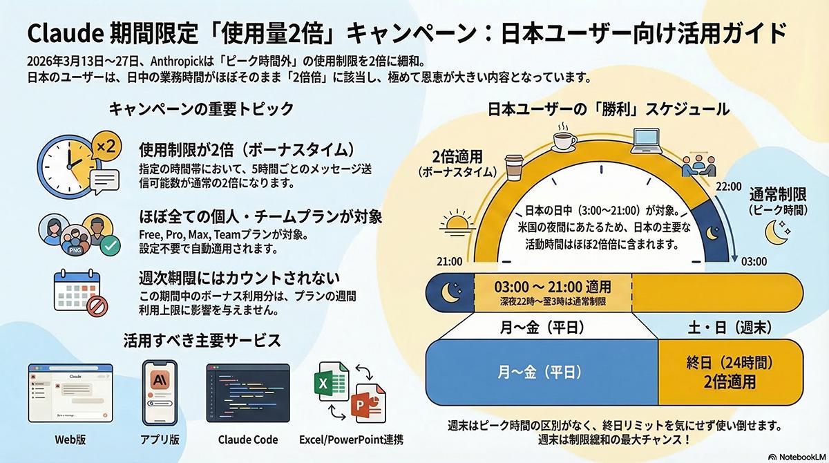 オフピーク時間帯に追加で得られた利用枠は、プランごとに定められている週間の使用量制限にはカウントされない仕様である。利用上限緩和が適用されるサービスは多岐にわたる。Web版、デスクトップ版、モバイル版のClaudeアプリに加えて、コーディング支援ツールClaude Codeや非コーディング業務支援のCoworkが対象となる。米Microsoftの製品向けに提供されているAI機能Claude for ExcelおよびClaude for PowerPointを利用する際にも同キャンペーンが適用される。Anthropicは大手AI企業の中でも利用制限の厳しさが指摘される傾向にあったが、2025年12月末にも一部の有料プランを対象に制限を緩和した実績がある。