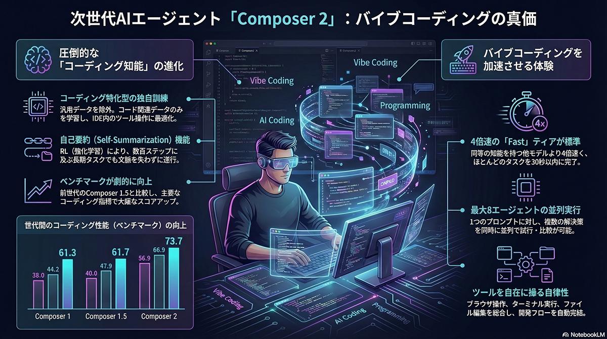 性能面において、Composer 2は継続事前学習と強化学習を採用しており、コードベースのナビゲーションやファイル編集、ターミナル操作を繰り返して解決策を導き出すような長期的なコーディングタスクの実行能力が強化されている。