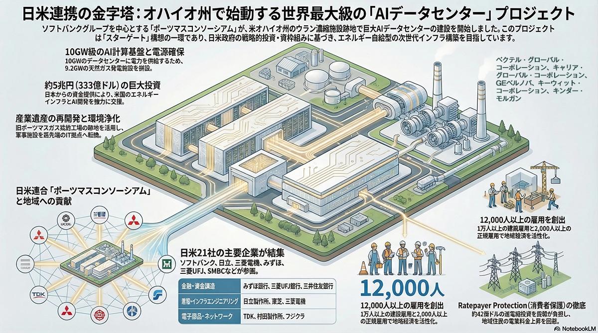 米エネルギー省はオハイオ州南部ピケトン近郊にある旧ポーツマスガス拡散工場の跡地を活用し、AIの商業開発を支える大規模データセンターとそれに付随する専用電源インフラを整備する。このプロジェクトを推進するため、日米の主要企業や金融機関で構成される「ポーツマスコンソーシアム」が発足した。コンソーシアムには日本からソフトバンクグループが中核として参画するほか、日本側からはが12社が参画しており。住友電気工業、TDK、東芝、パナソニックホールディングス、日立製作所、フジクラ、みずほ銀行、三井住友銀行、三菱電機、三菱UFJ銀行、村田製作所といった企業が名を連ねている。