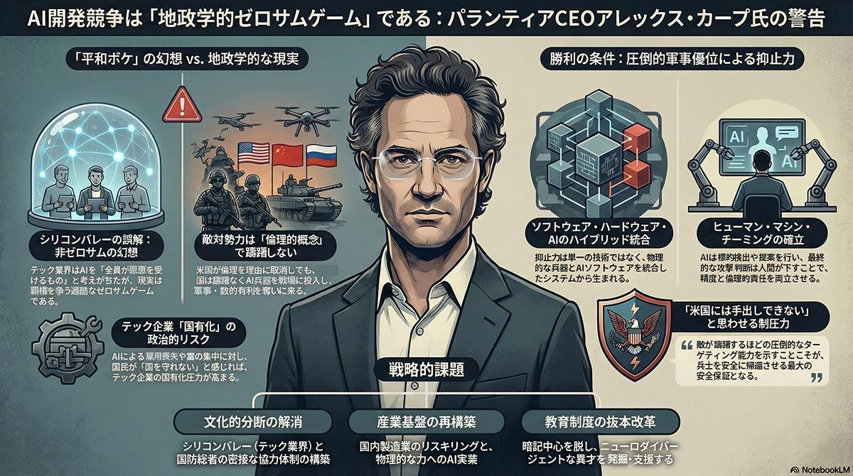 米国のビッグデータ・AI企業であるパランティアは、戦場における膨大なデータの統合とAI分析を通じて、米軍やウクライナ軍の作戦遂行能力を根本から変革してきた。とりわけウクライナの戦場は最新の軍事技術の試験場となり、同社のシステムがロシア軍の攻撃を防ぐための生死を分けるインテリジェンスを提供している。またイランとの紛争においてもパランティアのデータ分析基盤とAIプラットフォームの連携によって、ターゲットや主要拠点を的確に無力化するなど大きな成果をあげてきた。同社のカープCEOはメディアインタビューを通じ、シリコンバレーに蔓延する「AI開発は誰もが恩恵を受ける平和的な非ゼロサムゲームである」という認識を真っ向から否定する。アレックス・カープ氏によれば、現実のAI競争は米国と中国あるいはロシアのどちらかが主導権を握る、勝者がすべてを得るゼロサムゲームにほかならない。米国のテック企業がプライバシーや倫理的な懸念を盾にAIの軍事利用を躊躇したとしても、敵対国は戦場でAIをためらいなく実戦投入してくる。テック業界の人間は軍や戦場の現実と接点がないため、両者には深い文化的分断が存在するが、平和的な理想論に逃げ込み現実から目を背ける態度は、自国を直接的な危険にさらす行為だと同氏は断じる。