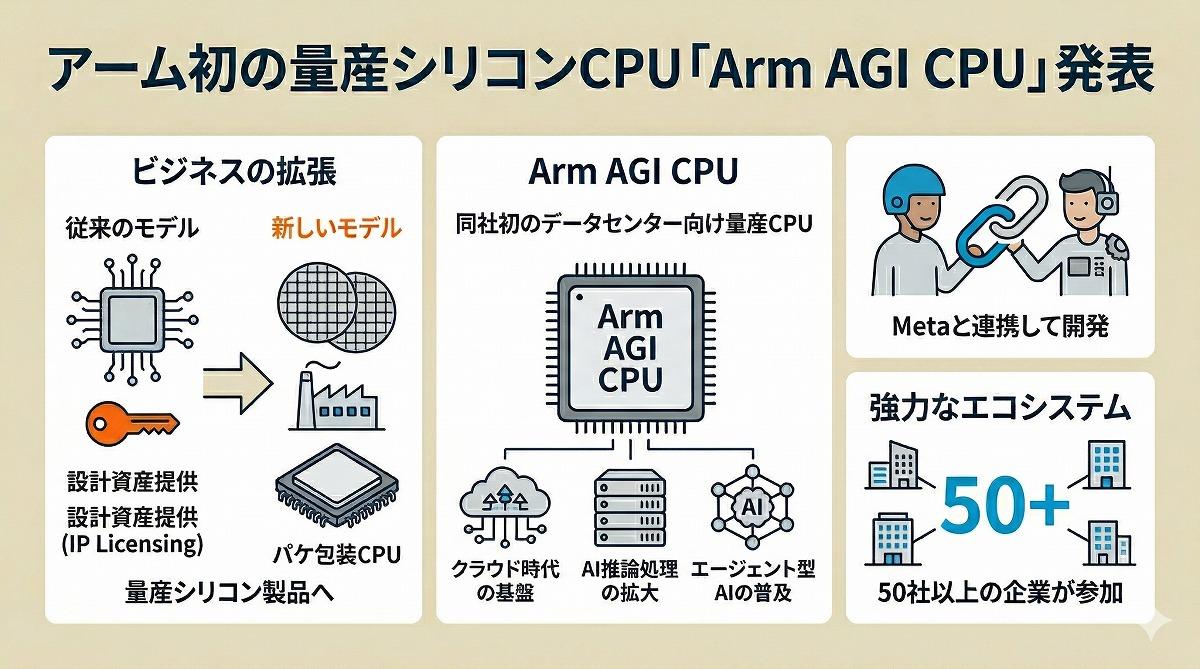 またアームは、Metaと連携してArm AGI CPUを開発したとしている。あわせて、50社を超える企業がこの取り組みを支えるエコシステムに参加すると説明した。アームは、設計資産の提供に加えて、自社設計の量産CPUを打ち出すことで、AIとデータセンター分野での事業拡大を進める構えだ。